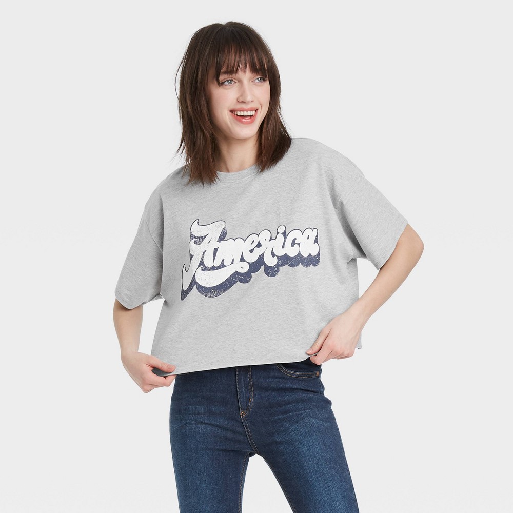 Add effortless, casual style to your wardrobe with this Women's America Cropped Short Sleeve Graphic T-Shirt - Gray. Featuring cool graphics on the front, this tee is sure to turn a few heads wherever you go. Made of a polyester-cotton blend, this graphic tee fits well on the shoulders for the right comfort. Pair it with straight leg jeans and sneakers or layer it with a jean jacket to complete your look. Gender: female. Age Group: adult. Pattern: letters.