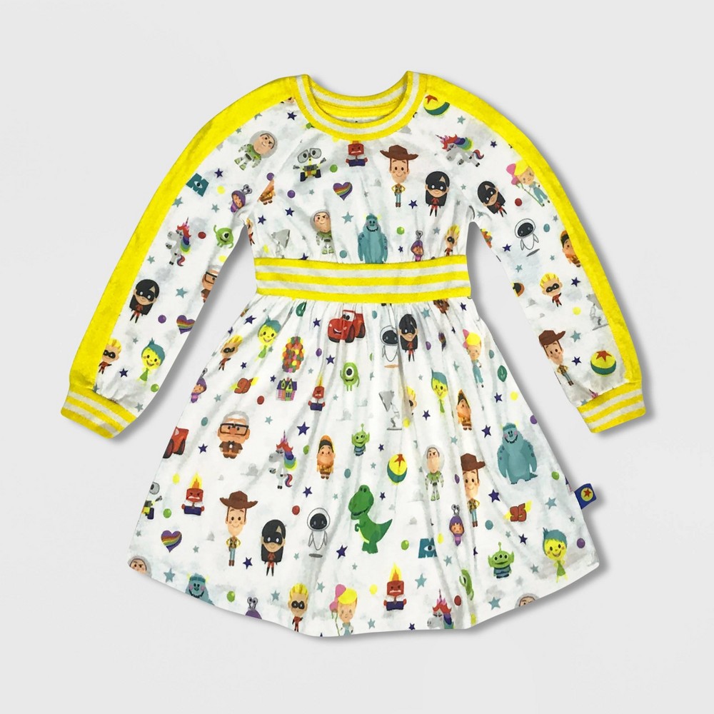 Girls' Disney World of : Beloved buddies from Pixar favorites add their animated style to this sweet dress for toddlers featuring their favorite characters from Toy Story, Inside Out, Monsters, Inc., Up, Cars, and more. Characters include Woody, Buzz Lightyear, Aliens, Bo Peep (Toy Story); Sulley, Mike Wazowski, Boo(Monsters, Inc.); Joy, Anger, Rainbow Unicorn (Inside Out); Mater, Lightning McQueen (Cars); Carl Fredricksen, Russell (Up); Dash and Violet Incredible (The Incredibles); and WALLE (WALLE). Genuine, Original, Authentic Disney Store Product. Size: 5. Color: yellow. Gender: female. Age Group: kids. Pattern: Fictitious Character. Material: Polyester.
