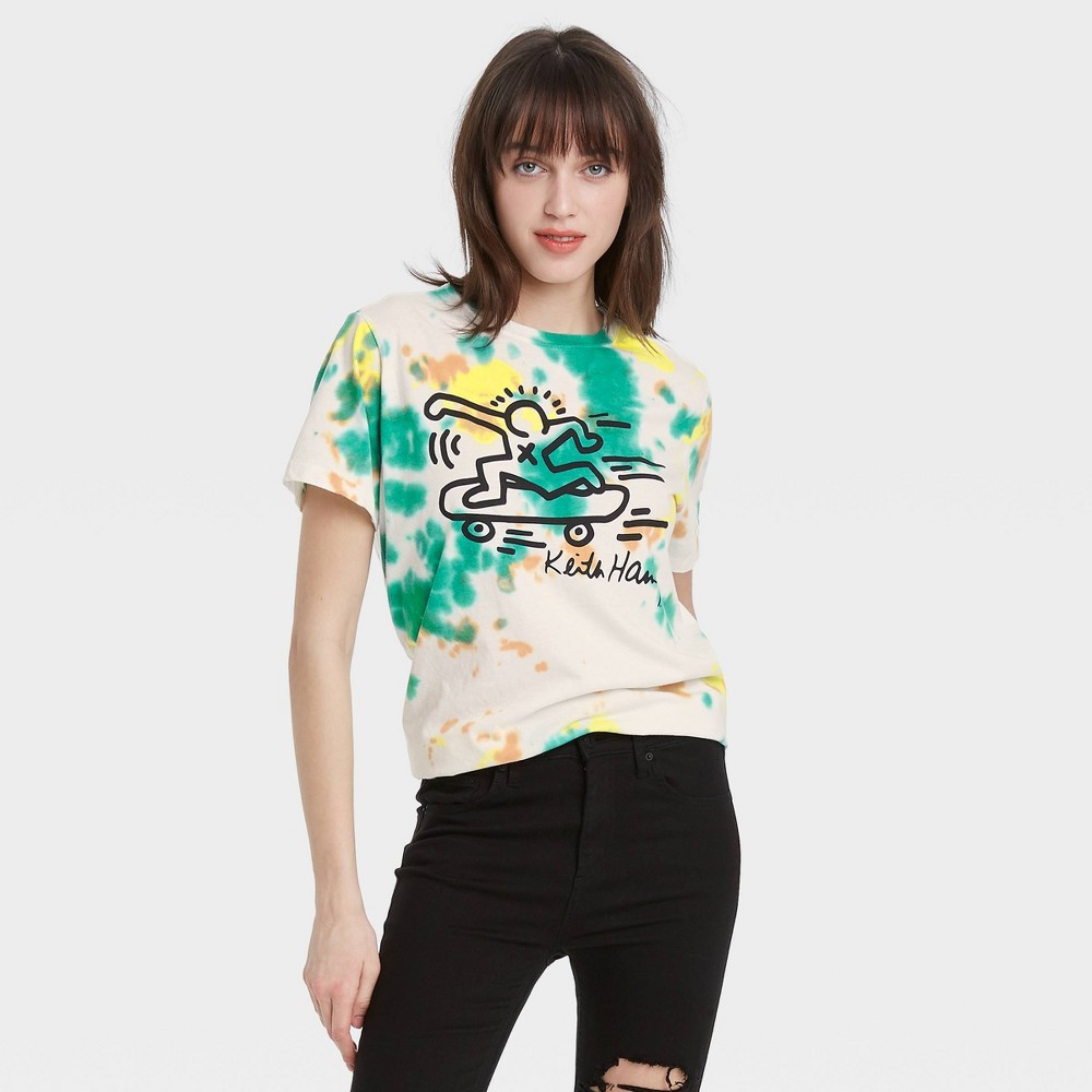 Style yourself a casual-chic work-to-weekend look with the Women's Keith Haring Skateboard Tie-Dye Boyfriend Short Sleeve Graphic T-Shirt - White. This wardrobe basic allows you to put together a range of looks and lets you easily wear it with everything from dark-wash jeans and plaid ponte pants to camo joggers. The cotton-blend fabric provides you with breathable comfort from day to night and season to season. Tuck it into shorts or wear it untucked over leggings and sneakers for casual hangouts. Gender: female. Age Group: adult. Pattern: Tie Dye Design.
