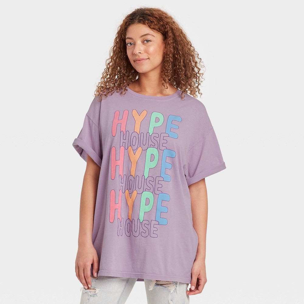 Style yourself a casual-chic work-to-weekend look with the Women's Hype House Repeat Short Sleeve Graphic T-Shirt - Purple. This wardrobe basic allows you to put together a range of looks and lets you easily wear it with everything from dark-wash jeans and plaid ponte pants to camo joggers. The cotton-blend fabric provides you with breathable comfort from day to night and season to season, and the relaxed silhouette makes for ease of layering and a great fit. Size: XS. Gender: female. Age Group: adult. Pattern: letters.