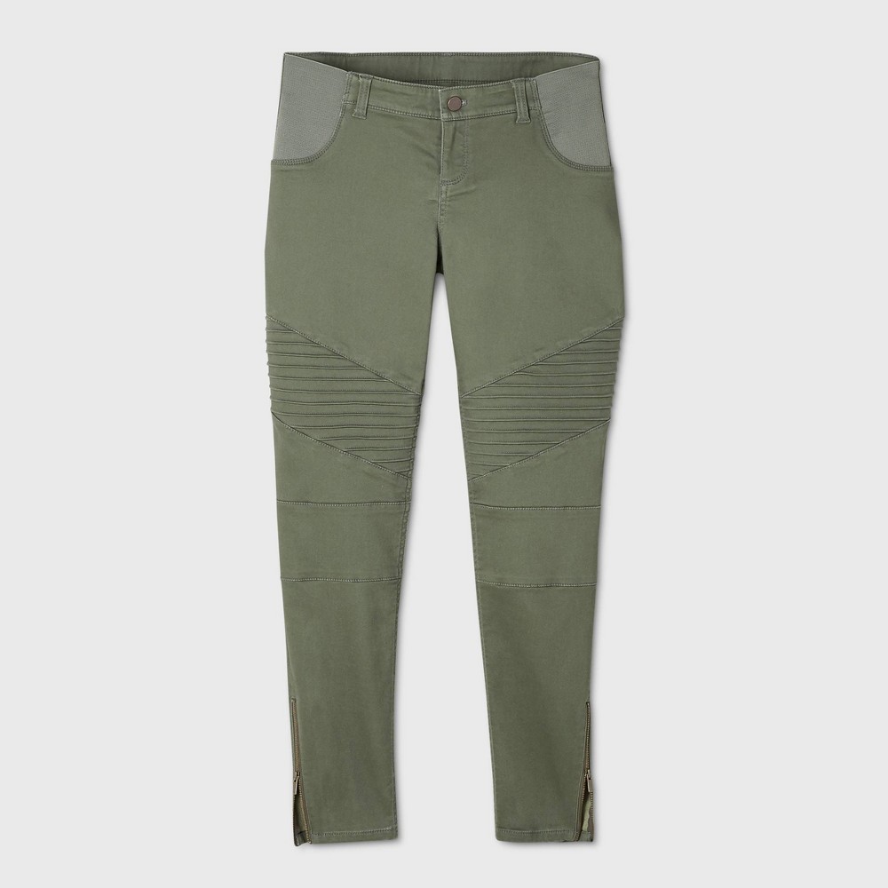 Zipper and moto detailing through the legs give these maternity jeggings extra interest. Power stretch denim sculpts and shapes while adjusting to your changing body. Elastic panels at the waistband fit comfortably throughout and after pregnancy, and the functional fly makes it easy to style just like your regular jeans. Size: 00. Color: Olive Green. Gender: female. Age Group: adult. Pattern: Solid. Material: Cotton.